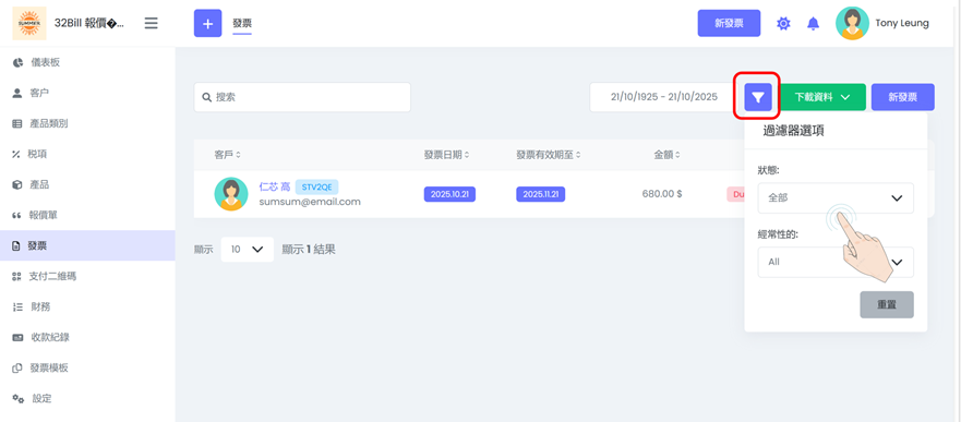 步驟1: 在發票列表中,點擊小漏斗,選擇狀態,點擊下載資料。