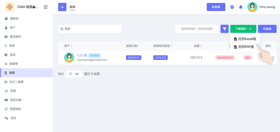 步驟2: 點擊Excel 檔案或PDF 檔案,檢視已匯出之發票。