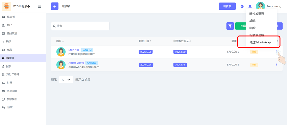 步驟1: 報價單列表中點擊操作選擇「傳送WhatsApp」。