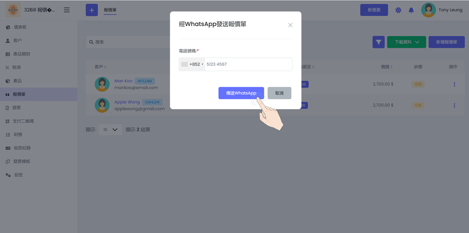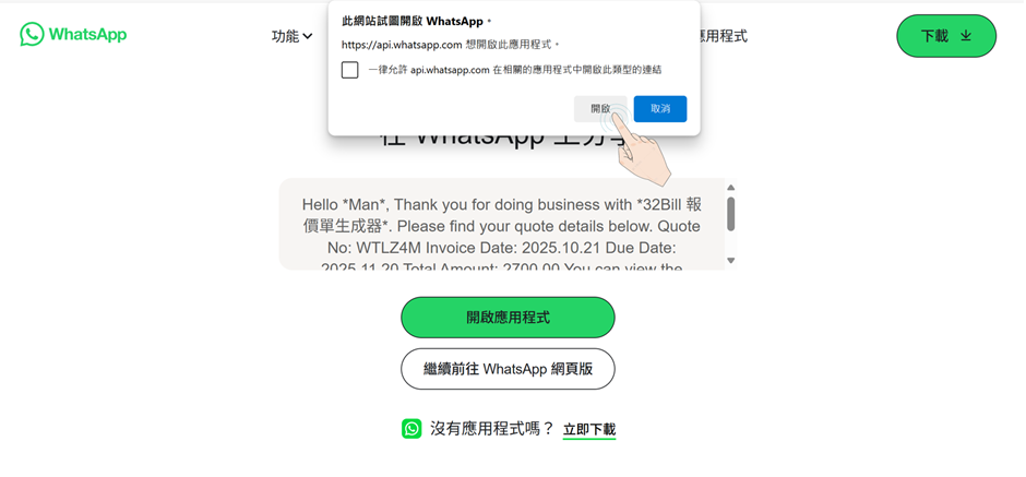 步驟2: 輸入WhatsApp電話號碼會直接連接到客戶的WhatsApp程式中發送報價單。
