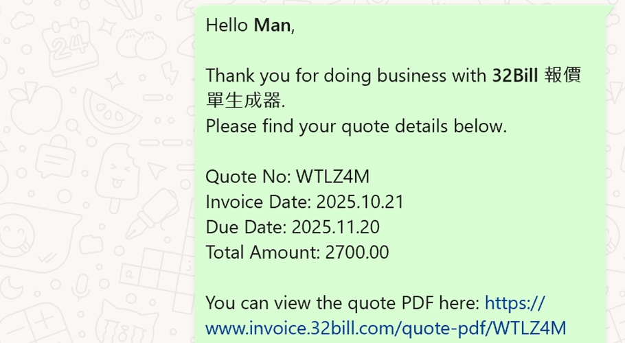 步驟4: 客戶WhatsApp電話號碼會收到下列信息,客戶可於此處點擊PDF鏈接查閱報價單。